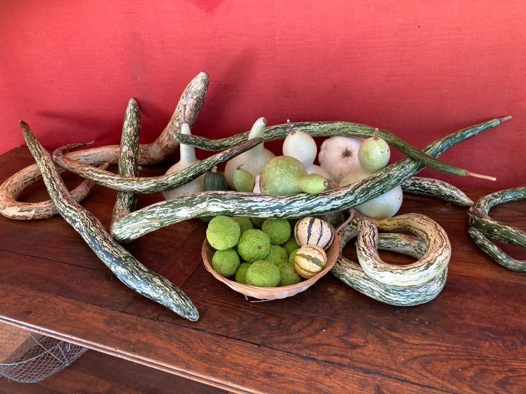 Côté cucurbitacées, on distingue des calebasses vert pâle, des pâtissons blancs et d’extraordinaires courges serpent à la peau verte marbrée. Les aubergines violettes et les longs haricots violets créent la complémentarité des couleurs tandis qu’un bouquet d’asters blancs et quelques feuilles de laurier apportent la touche de légèreté. On distingue aussi un fruit rond et bosselé, très décoratif; il s’agit du fruit de Maclura pomifera, l’orange des Osages. L’arbre est originaire d’Amérique et fut surnommé oranger des Osages pour une tribu indienne de ce nom. Il est peu courant en Europe bien qu’il puisse résister jusqu’à -15 °C en principe. Mis à part l’apparence, il n’a aucun lien avec les citrus.