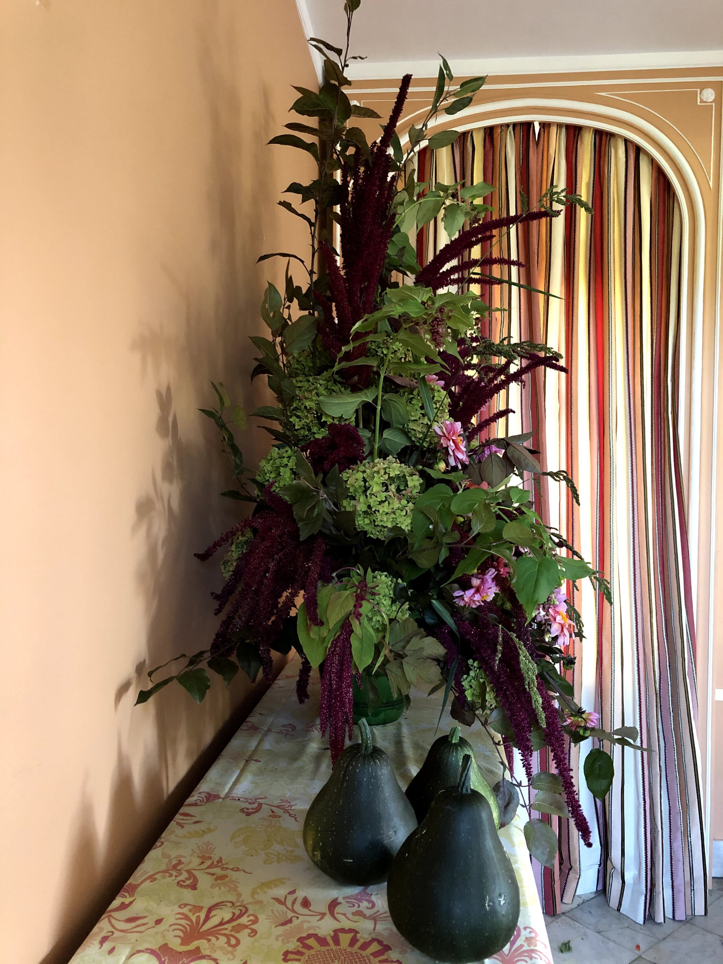 Quelques dahlias lumineux viennent éclairer l’ensemble et assortir les couleurs à mon l’intérieur. Pour une touche de légèreté j’ai ajouté quelques graminées sauvages, peu visibles sur la photo. Enfin les 3 courges placées à gauche créent une ambiance de nature morte.