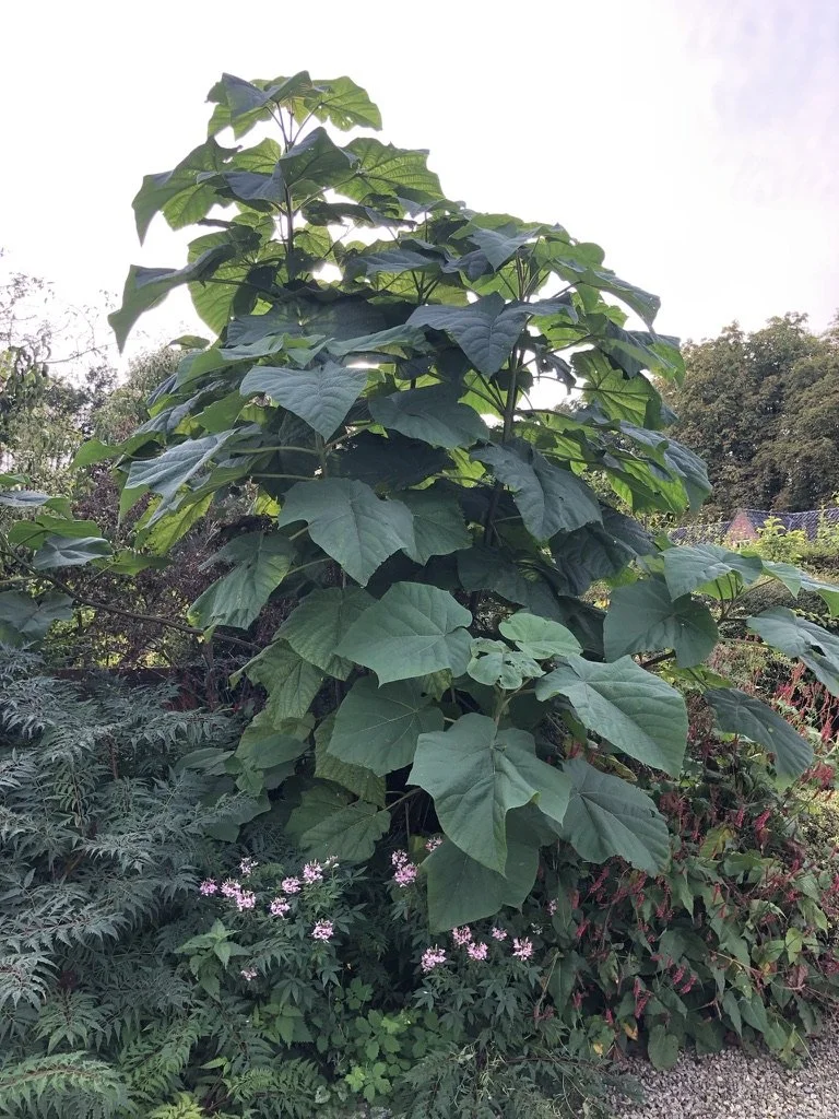 Tout comme le jacaranda, le paulownia peut être utilisé comme plante de feuillage. En le recépant au ras du sol après l’hiver on obtient des pousses spectaculaires en une saison et surtout des feuilles surdimensionnées. N’espérez cependant pas de fleurs en plus!