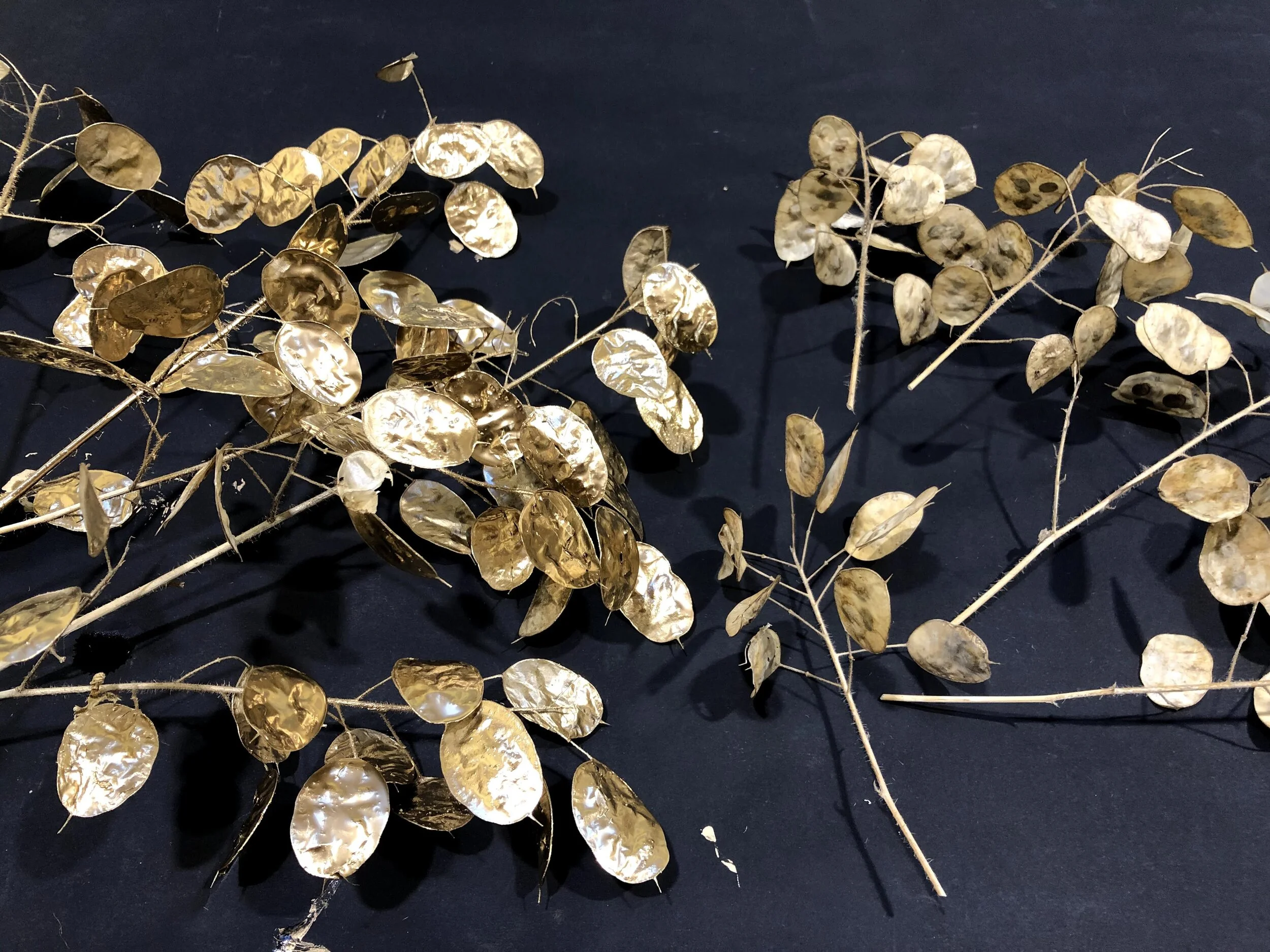 Le matériel séché à la fin de l’été va bien me servir pour les décorations de Noël. Les capsules des pavots sont jolis dorés ou au naturel, réunis en petits bouquets que l’on pourra déposer sur les branches. Les monnaies du pape sont parfois un peu ternes et un peu de peinture les rendra plus lumineux.