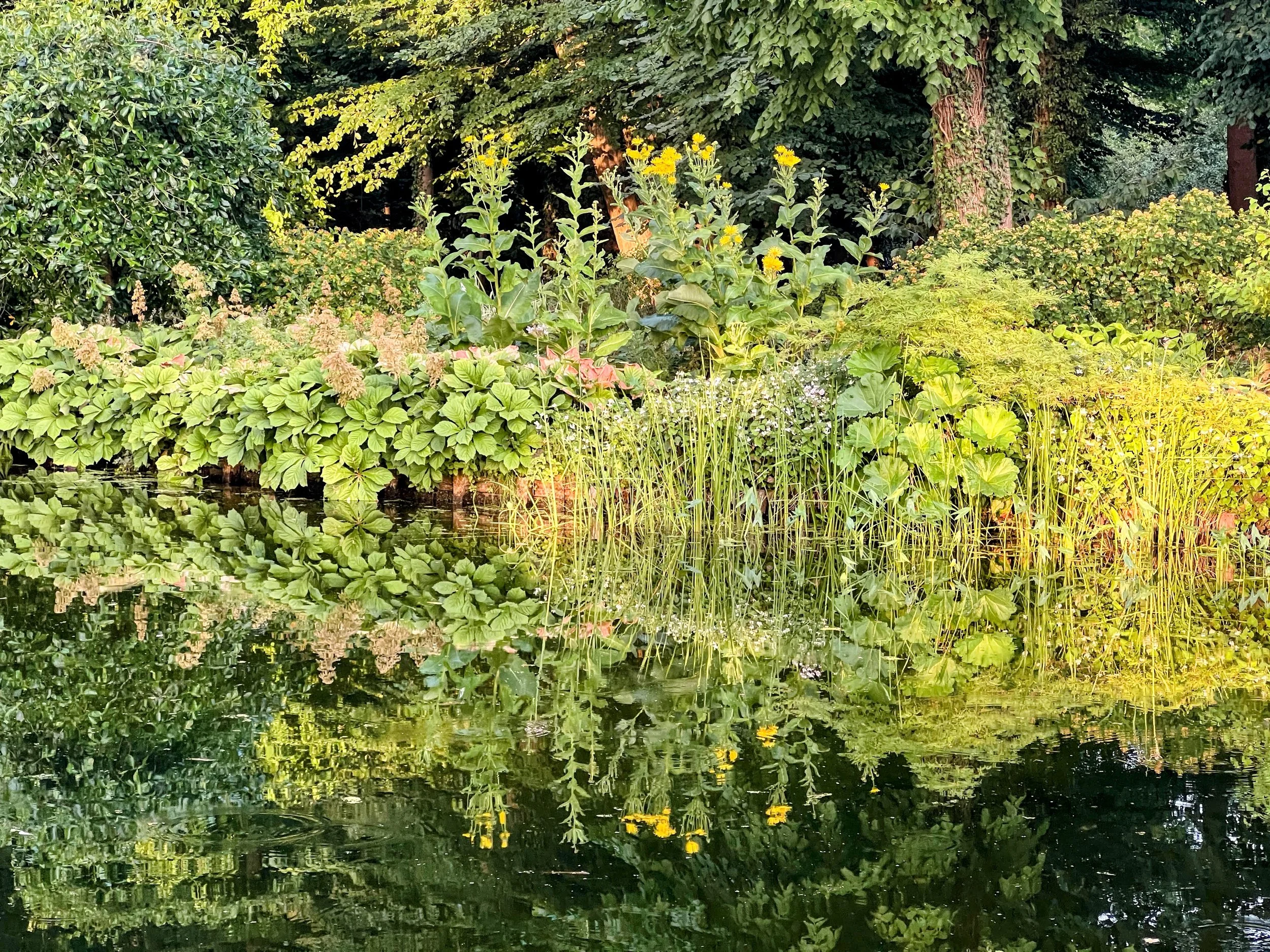 Passons maintenant en terrain humide pour découvrir une sorte de marguerite jaune géante: la grande aunée. Contrairement aux précédentes, il lui faut un terrain frais. Au bout de quelques années cette vivace forme de belles touffes qui produisent plusieurs tiges florales qui se dressent solidement. La masse que l’on voit ici se refléter dans l’étang provient à l’origine de deux plantules achetées dans de petits godets! Inula ne semble pas avoir d’ennemis, pas même les limaces.