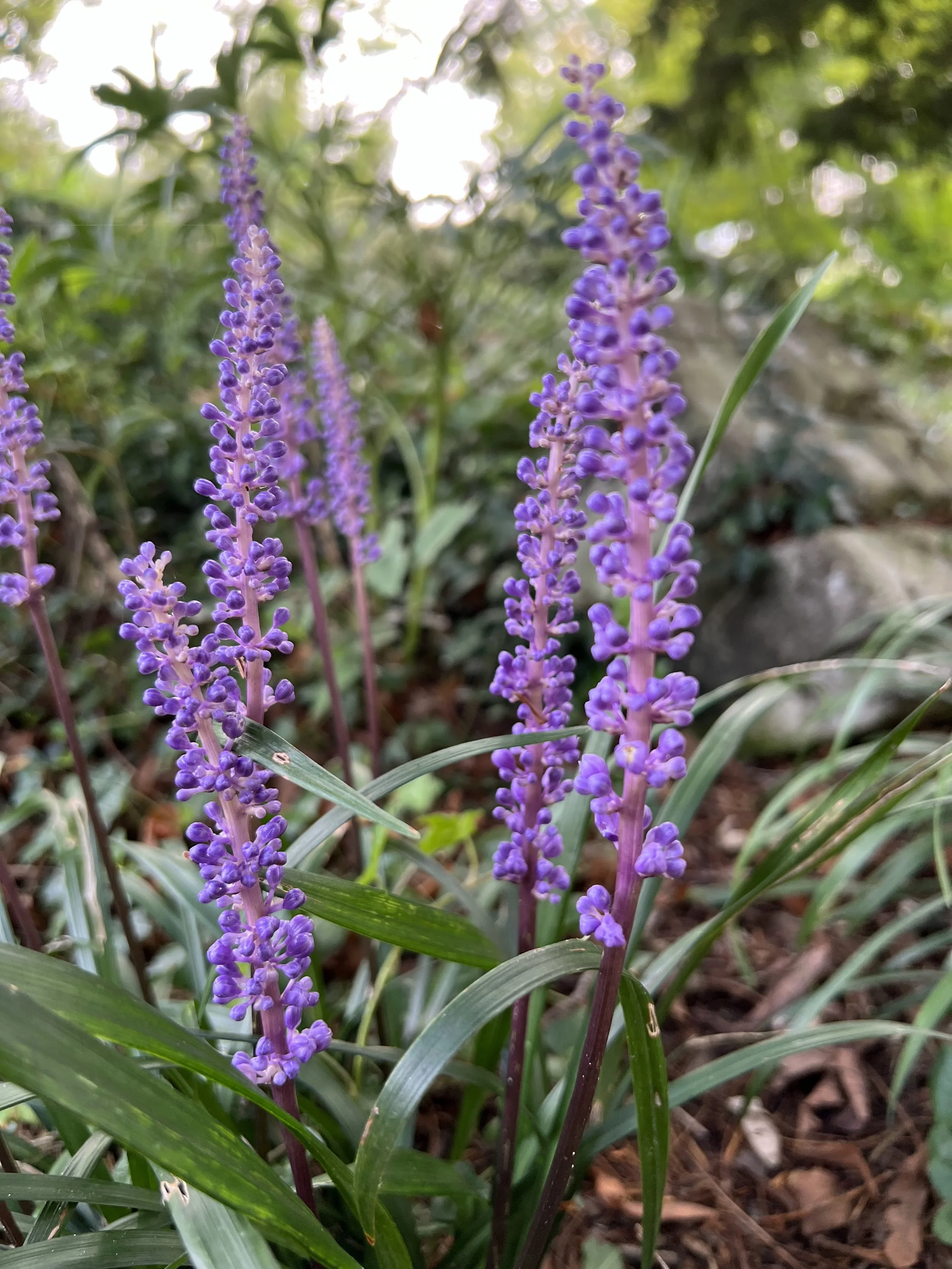 Cette plante venue d’Asie appartient à la familles des asparagaceae tout comme les muscaris, les asperges, les scilles, les jacinthes, le muguet et beaucoup d’autres. Ce n’est pas un bulbe mais une vivace avec un très beau feuillage persistant à lanières. La rosette de feuilles produit des épis violets qui peuvent atteindre 30 cm de haut et qui portent de toutes petites clochettes. Contrairement aux bulbes printaniers, le Liriope fleurit d’août à octobre environ. Il a été nommé pour la nymphe Liriope, une des naïades. La mythologie grecque foisonne de nymphes, très utiles à la nomenclature botanique.