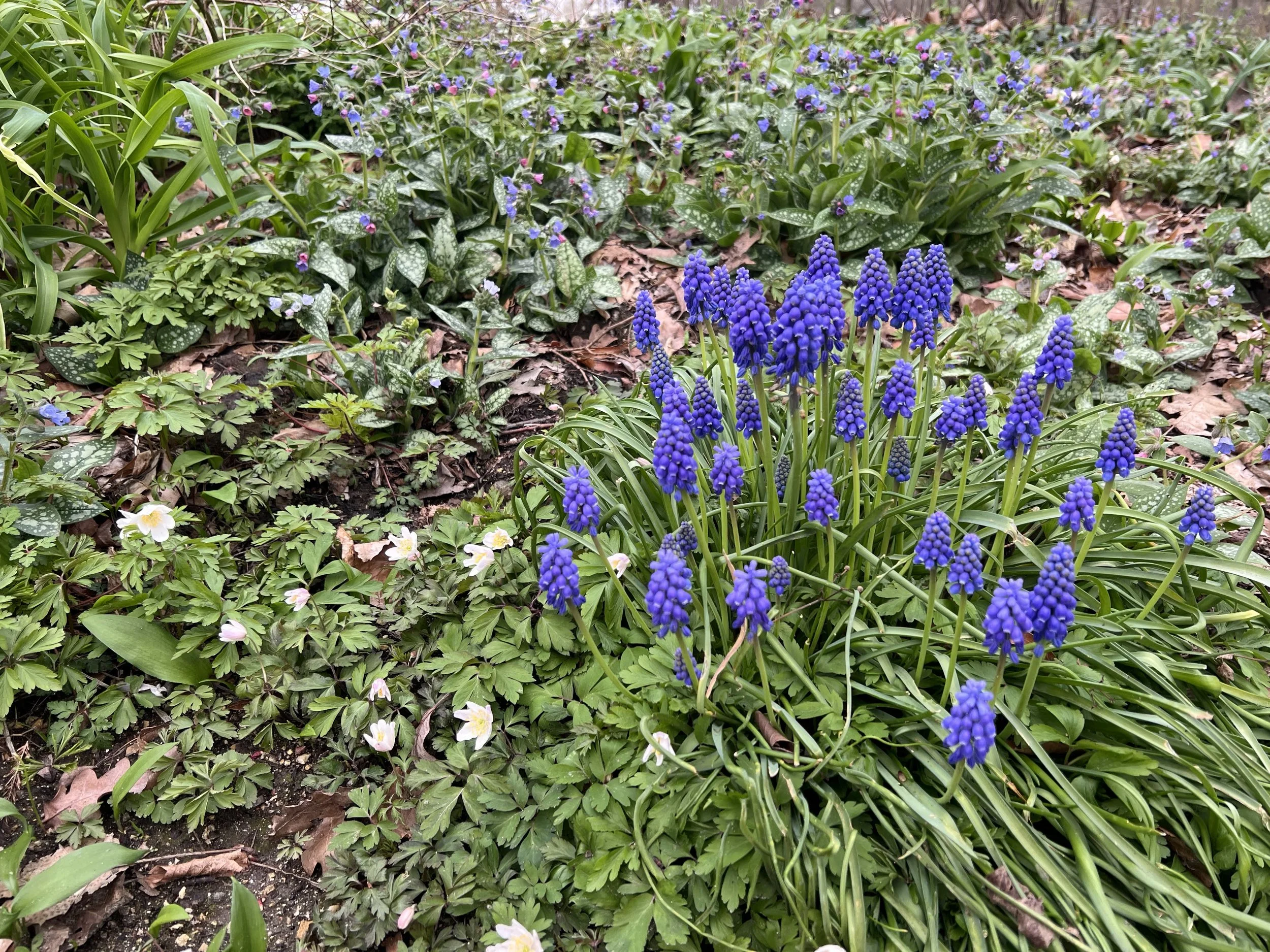 L’espèce la plus communément cultivée est Muscari armeniacum (d’Arménie). Le genre est en réalité répandu dans toute la Méditerranée et une partie du Proche Orient. Très rustiques, les muscaris se développent tout aussi bien plus au nord, contents d’un sol frais ou sec et supportant le froid comme la chaleur. En quelques années, les bulbes se multiplient pour former de belles touffes portant de nombreuses fleurs. Ci-dessus, dans une ambiance de sous-bois, ils fleurissent en même temps que l’anémone sylvie et les pulmonaires.