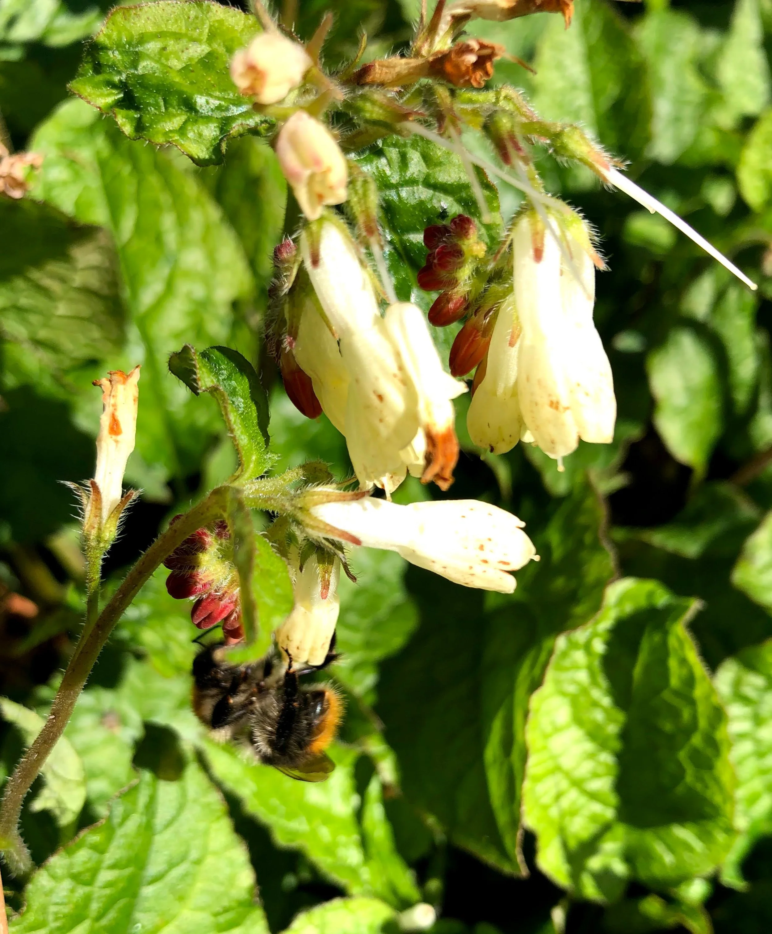 Et en voici un sur la petite consoude couvre-sol à fleurs jaune pâle, Symphytum tuberosum. La plante, qui ne dépasse pas 30 cm, s’étend rapidement par rhizomes, devenant vite envahissante mais couvrant très efficacement le terrain. Sa floraison précoce est très attirante et ses fleurs tubulaires ne sont pas un obstacle pour les bourdons.
