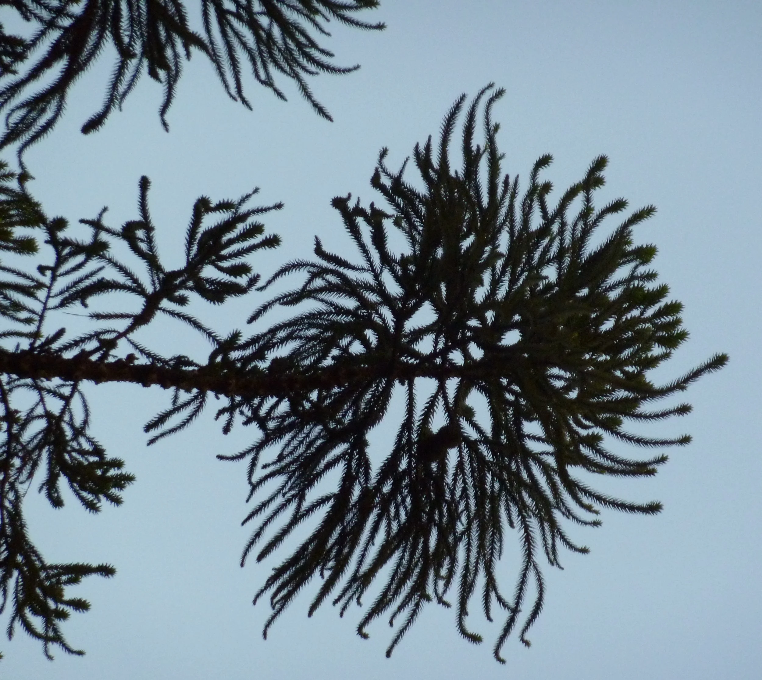 Quand il est jeune, cet arbre est tellement régulièrement étagé et raide qu’on pourrait le prendre pour un arbre de Noël en plastique! A le regarder de plus près, on voit que le tronc et les branches sont couverts d’écailles triangulaires disposées en spirale, dures et piquantes. Cette véritable armure servait de protection contre les grands herbivores du jurassique, époque à laquelle ce conifère était largement répandu. Elle vaut à cet arbre le nom de ‘désespoir des singes’ en français ou ‘Monkey Puzzle Tree’ en anglais; impossible pour un singe d’y grimper ou de sauter de branche en branche! Voilà un nom bien peu flatteur pour un arbre qui est le symbole du Chili et l’arbre nourricier de tout un peuple: Araucaria araucana.
