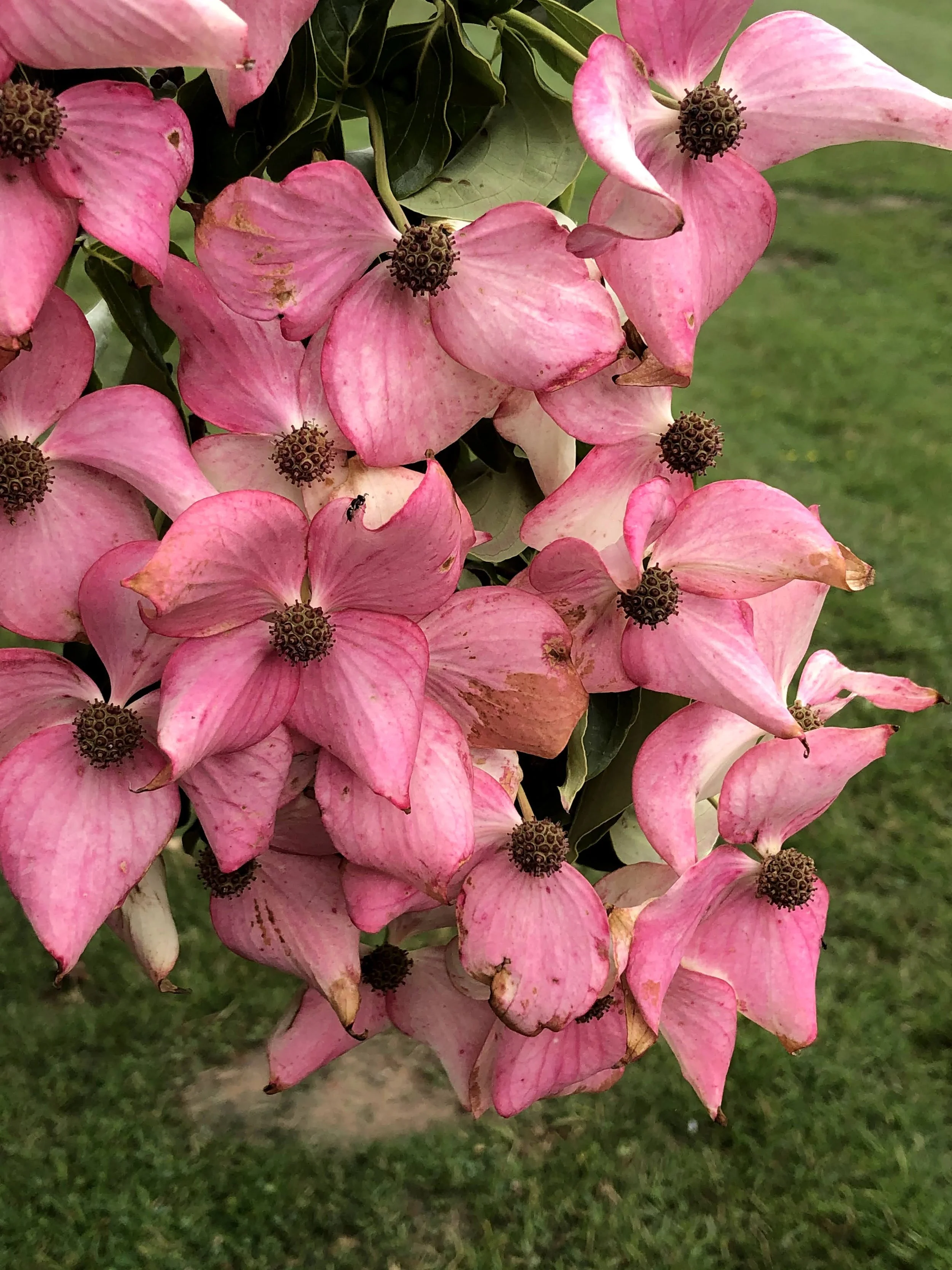 La raison pour laquelle ces petits arbres produisent un spectacle aussi étonnant est que notre regard (et sans aucun doute les visiteurs ailés) est attiré non pas par des fleurs mais par des bractées colorées. La fleur de ces cornouillers est en fait une petite boule insignifiante au centre de quatre grandes bractées disposées en carré régulier. Ce ne sont donc pas des pétales et le détail est d’importance: là où les pétales des fleurs se fanent au bout de quelques jours de chaleur et tombent rapidement, les bractées qui sont en fait des feuilles modifiées, persistent beaucoup plus longtemps. Toutes petites et vertes au départ, elles vont progressivement s’agrandir et devenir blanches ou roses avant de tomber progressivement. Beaucoup de bractées blanches virent au rose en vieillissant. Toute cette progression chromatique est passionnante à observer.