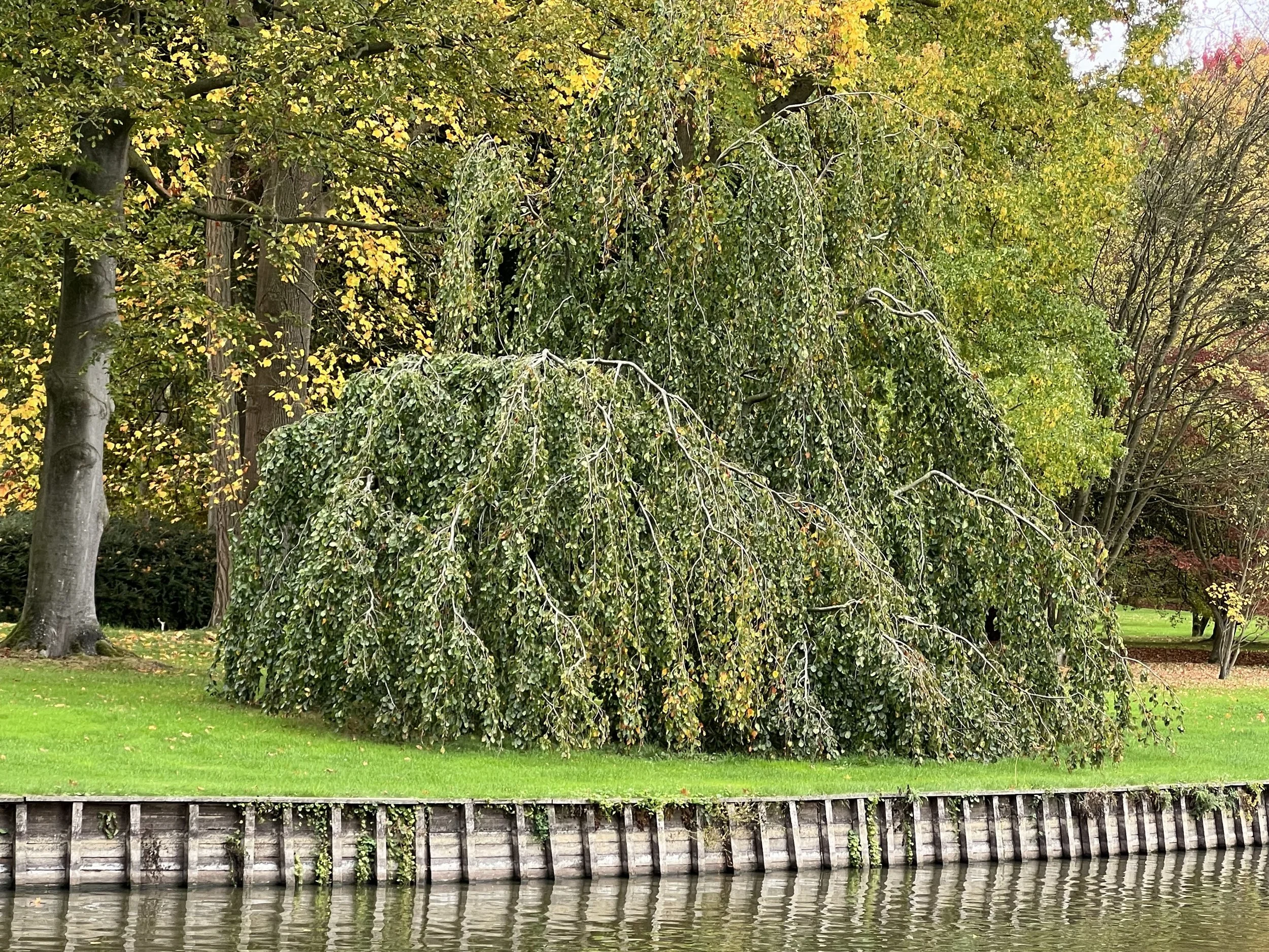 Nyssa sylvatica ‘Autumn Cascade’, que j’ai planté au bord de l’étang il y a quinze ans, n’est pas tout à fait convainquant comme pleureur. Il a peut-être l’avantage de rester plus petit que l’espèce type mais n’est pas particulièrement retombant. Si sa coloration est lumineuse, elle n’atteint jamais la belle couleur rouge de certains Nyssa.
